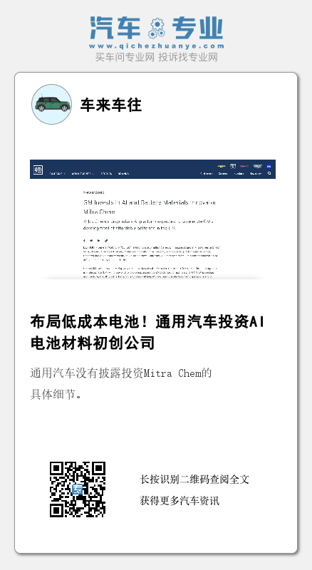 据CNBC报道,8月16日,通用汽车宣布正在领投人工智能(AI)电池材料初创公司Mitra Chem 6000万美元的B轮融资项目。Mitra Chem致力于为电动汽车开发低成本电池。