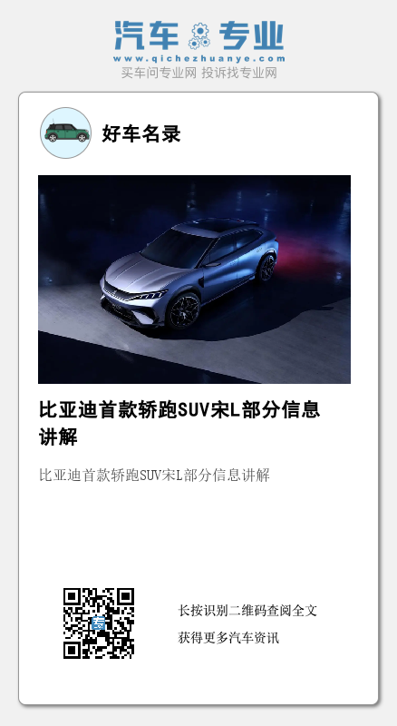 近几年,比亚迪的风头非常强势,在常规车型热销的同时,比亚迪也在向着个性化汽车的方向发展,前不久曝光的宋L(图片)就是一款非常值得期待的车型,该车作为一款中型纯电SUV,采用了轿跑SUV的造型设计,基于e平台3.0打造的智能电四驱车型,下面看看新车。