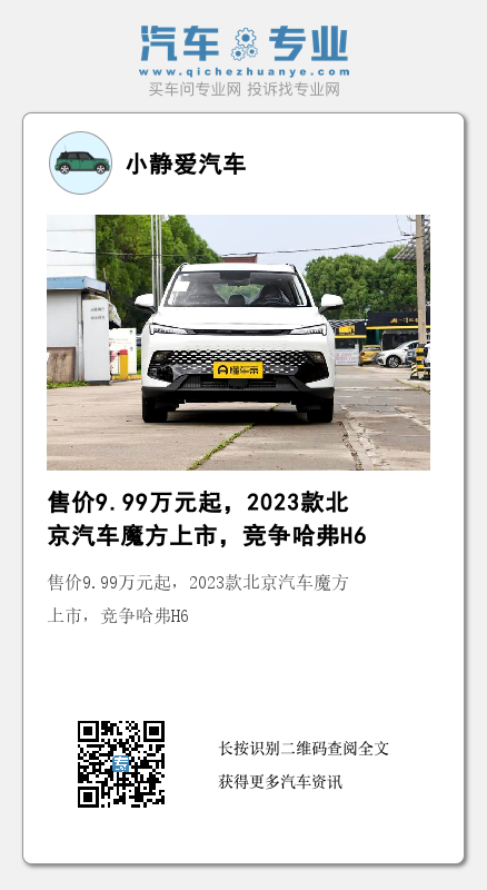 近日,我们从相关渠道获悉,2023款北京汽车魔方(图片|配置|询价)正式上市,新车定位紧凑级别SUV,2023款共推出4款配置车型,售价区间为9.99-13.19万元,相比老款车型,主要对配置进行升级,其它方面,没有什么变化。