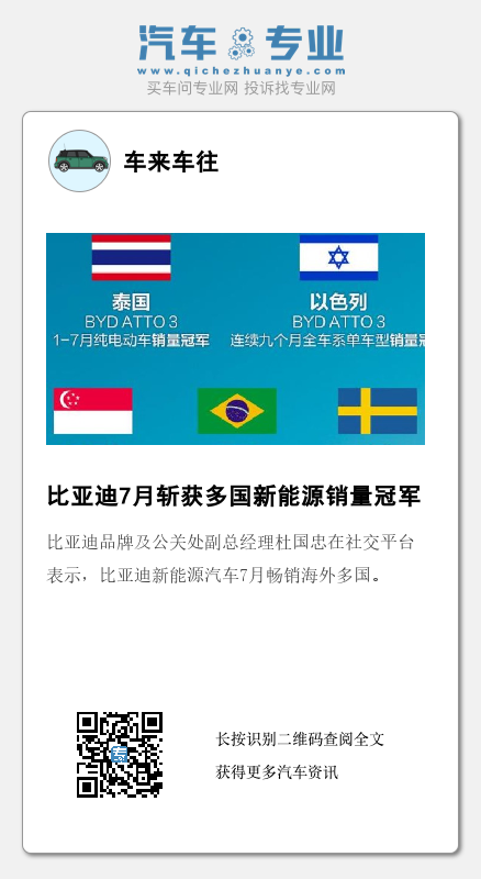 比亚迪品牌及公关处副总经理杜国忠在社交平台表示,比亚迪新能源汽车7月畅销海外多国。