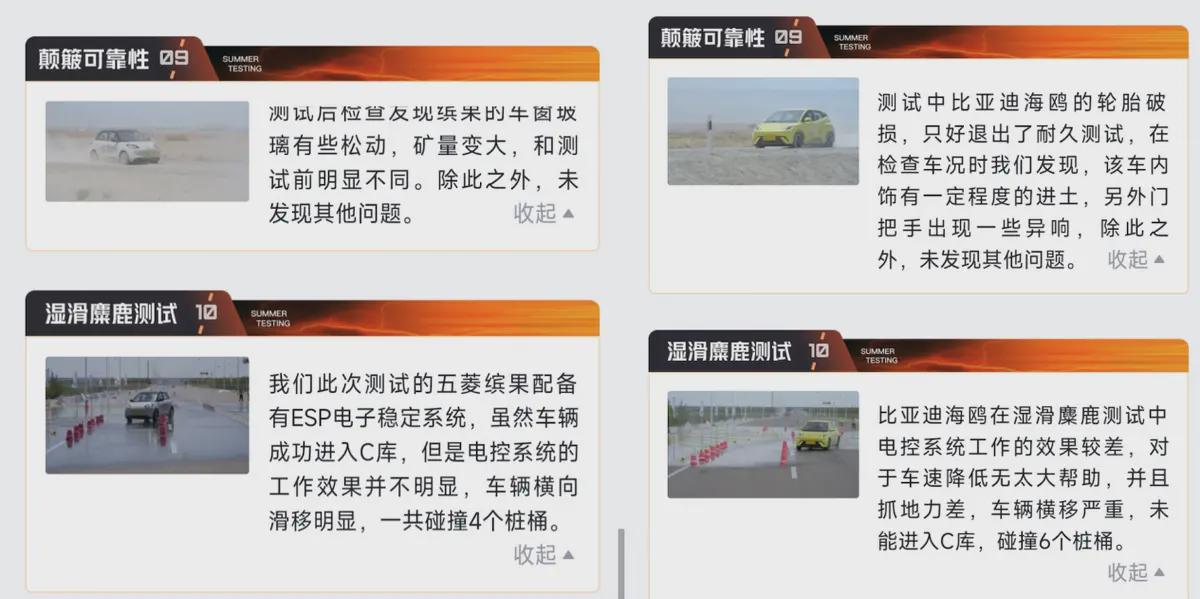 动态中,海鸥与缤果也都是参与了前面提到的夏测。缤果在其中以A级综合评分、同级第二的成绩笑到了最后,并且包括强化颠簸路、湿滑麋鹿两大测试中,缤果都是表现出色,特别在苛刻的湿滑麋鹿测试中,缤果凭借ESC系统的帮助,以80km/h时速通过了测试并成功驶入C库,而海鸥则因抓地力较差和电控系统工作效果太差的问题未能驶入C库,而前面提到的颠簸路测试也是因轮胎开裂问题而中途退出。虽然哪吒AYA未能赶上这趟测试,但是说到这动态驾驶稳定,哪吒AYA并没有给到ESC配置,而是全系都需要花上4000元来购买选装包,看看打滑的海鸥,缺少刹车辅助、牵引力控制等系统的哪吒AYA,确实会让人有些担忧。