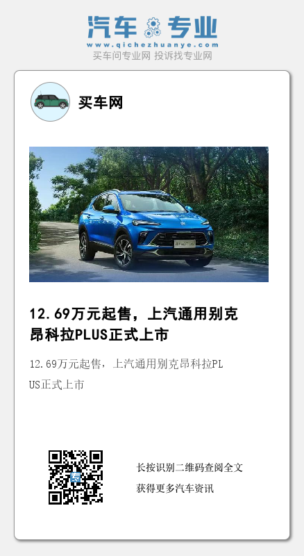 日前,买车网Buycar获悉,上汽通用别克昂科拉PLUS(图片|配置|询价)正式上市,售价分别为12.69万元和13.69万元,新车共推出两款车型,采用别克最新的设计理念,配备了一体式双10.25英寸屏幕,搭载1.5T发动机。