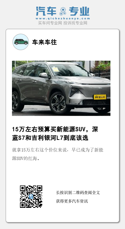 通过对比我们不难发现,吉利银河L7和深蓝S7这两款车的产品力都不差,其中深蓝S7空间更大,性能续航也够用,加上运动时尚的外观设计,手握15万预算选它说实话没啥大毛病;而吉利银河L7,则是在性能、续航方面有明显优势,并且底盘调校更好,有着不错的驾控质感,加上更丰富的配置加持,个人认为是更适合年轻消费者的选择。