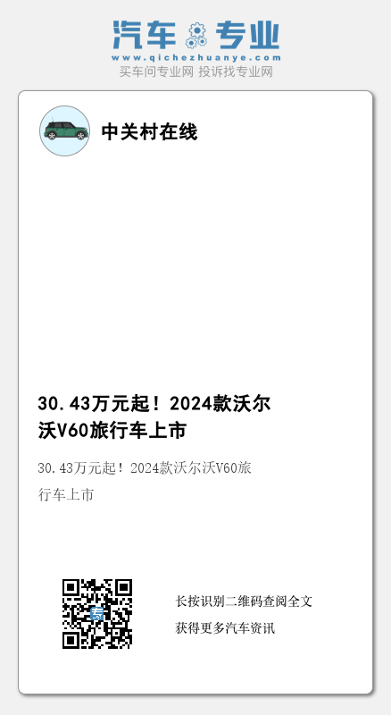 新款沃尔沃V60(图片|配置|询价)旅行车的上市将为消费者提供更多选择,带来更高品质的驾乘体验。