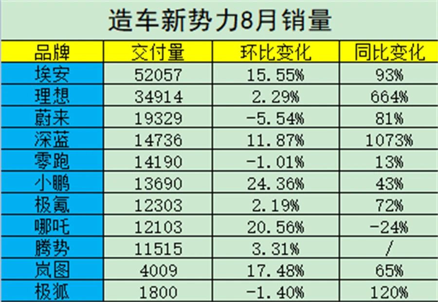 而从环比来看,多数造车新势力依然是正增长的,其中岚图汽车增长幅度最大,环比增长17.48%,紧随其后的埃安环比增长15.55%。值得一提的是,埃安在8月首次冲破5万台大关,不仅再次稳居造车新势力榜单榜首,也迈上了一个新的发展阶段。
