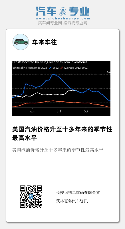 普通汽油的全国均价报每加仑3.811美元,高于去年同期,创下美国汽车协会1994年有纪录以来第二高的水平。这发生在价格进入秋季通常会下跌的时候。经历过相对便宜的夏季之后,对驾车者而言,这无异于U型反转。