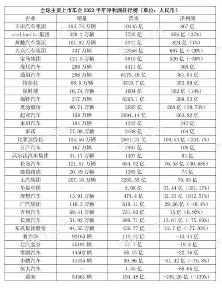 在统计的32家全球主要上市车企2023年半年净利润排行榜上,前十四名都被国外车企占据,且前十四名中只有特斯拉一家为新能源车企,其余均为传统车企。中国车企中净利润最高的为比亚迪,以109.54亿的净利润排在榜单的第十五名,其余的中国车企净利润普遍较低,排名均在十五名开外,甚至有好几家车企巨额亏损。