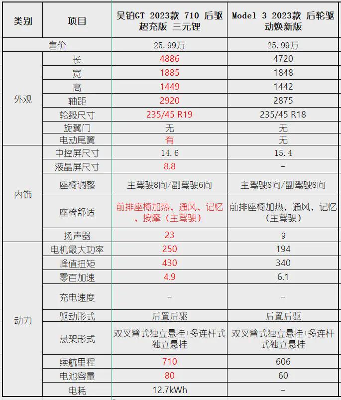 在价格一致的情况下,从下方产品力核心信息来看,昊铂GT相对于全新Model 3车身尺寸更大,配置更加丰富,动力续航等方面更加出色。
