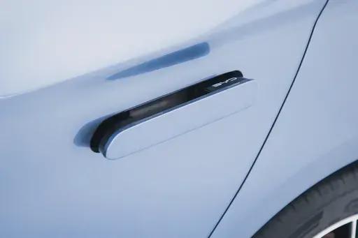 车身侧面整体轮廓简洁流畅,隐藏式门拉手看着不但美观,同时也降低了风阻系数。