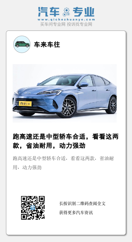 为什么说跑高速中型轿车合适,因为中型轿车尺寸大,跑起来稳定性好,车内空间宽裕,家人坐在后排不憋屈。还有中型轿车的动力都不错,驾驶起来有激情,满载五人不吃力。目前在售的中型轿车有几十款,在众多车型里面,看看这两款,省油耐用,动力强劲。