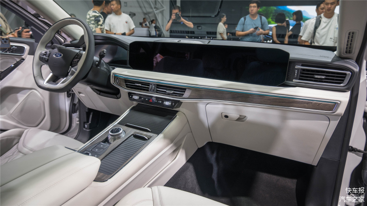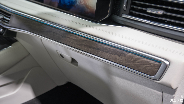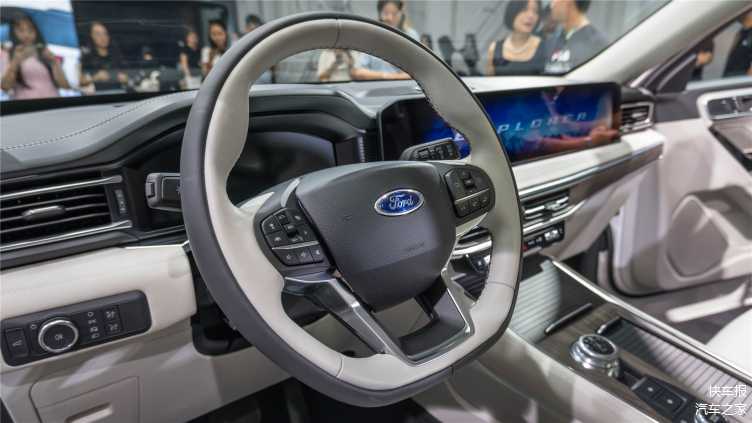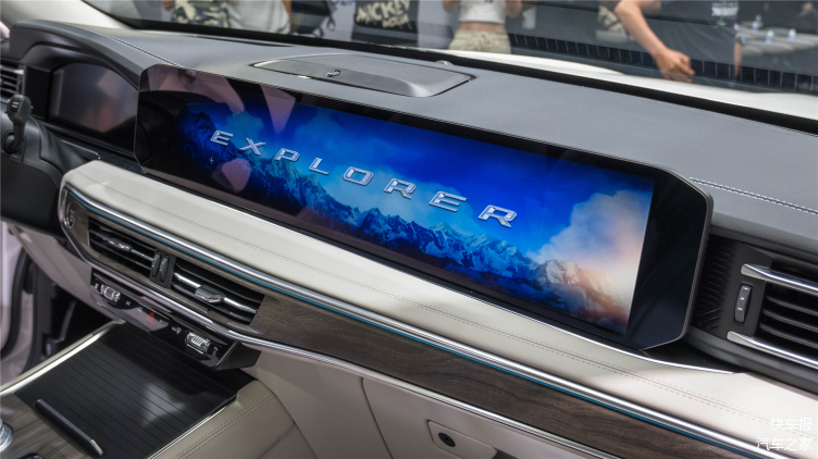 相比于外观的变化,内饰的豪华氛围则是肉眼可见的提升。之前福特探险者都比较爱用深色系的内饰配色,福特探险者赤金版一改常态,用上更明亮的瑶珠灰作为主色调,搭配圆弧橡树木材作为装饰,品质感也有飞跃性的进步,再搭配简约设计风格,整体氛围也更贴近一些高端品牌的豪华车。