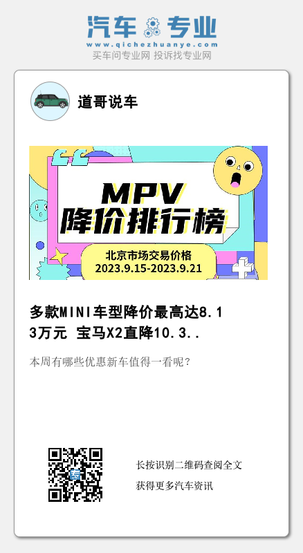 【文/财圈社&道哥说车 浅浅】秋高气爽,正值车市金九银十,本周有哪些优惠新车值得一看呢?
