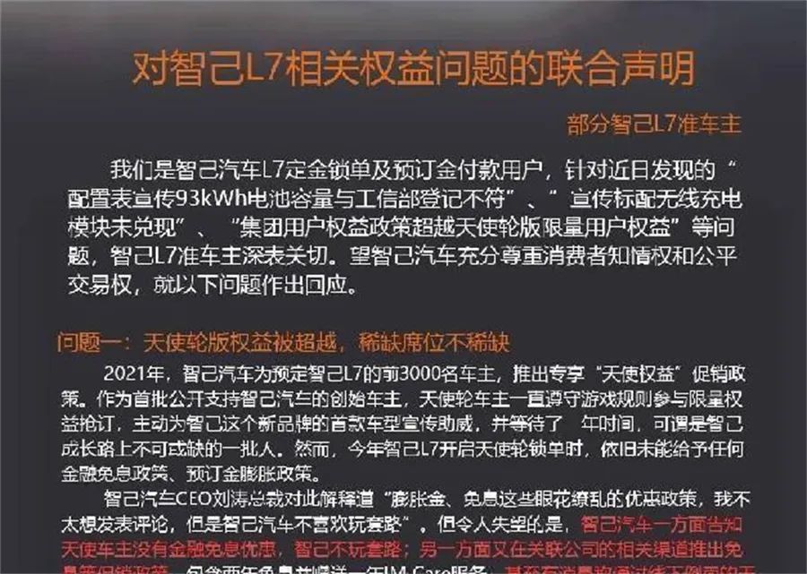 在首款车型智己L7还没有大规模交付时,智己汽车就引发了一波车主维权,超百名智己天使轮准车主发布联合声明维权,要求智己就“天使轮版权益被超越”、“升级激光雷达和高阶能量电池的条件未明确”、“电池容量虚假宣传”、“多项宣传配置未兑现”、“官方APP社区管理混乱”等问题作出回应。