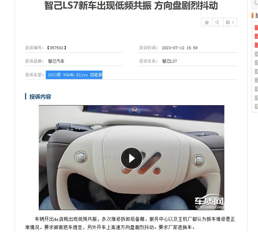 一位2023款90kWh Elite四驱版智己LS7车主在投诉中称:“车辆开出4s店既出现低频共振,多次维修拆卸后备厢,服务中心以及主机厂都认为新车维修是正常情况,要求顾客把车提走,另外开车上高速方向盘剧烈抖动。要求厂家退换车”。