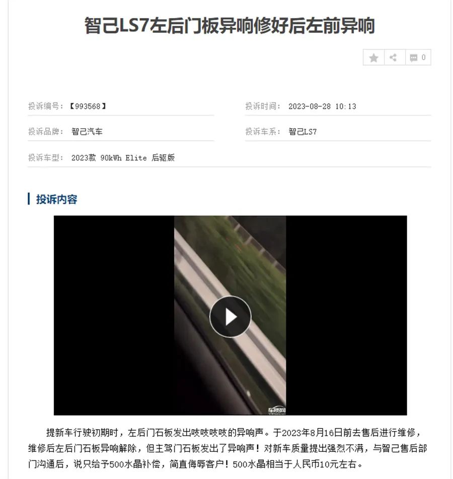 一位2023款90kWh Elite后驱版智己LS7车主在投诉中称:“提新车行驶初期时,左后门(饰)板发出吱吱吱吱的异响声。于2023年8月16日前去售后进行维修,维修后左后门板异响解除,但主驾门(饰)板发出了异响声!对新车质量提出强烈不满,与智己售后部门沟通后,说只给予500水晶补偿,简直侮辱客户!500水晶相当于人民币10元左右”。