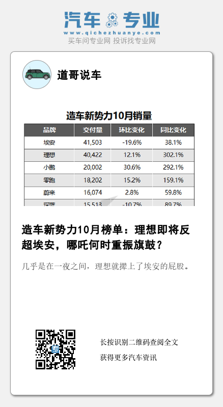 倒不至于是理想跑得有多快,只是埃安很明显有些力不从心。早在8月就跨过5万门槛的埃安,在10月又回落到了4万的交付量,环比下降-19.6%。反观理想,交付量实现新突破,环比增长12.1%,同比增长302.1%。