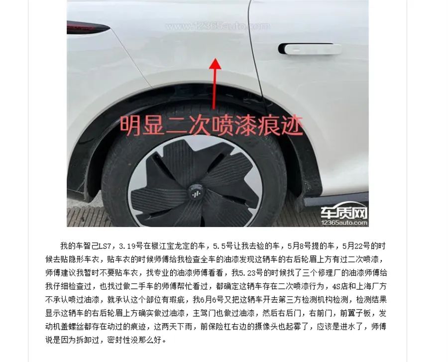 一位2023款90kWh Elite后驱版车主投诉“智己LS7隐瞒生产日期强制交付库存车”;另一位同款车型车主则投诉了“经销商出售二次喷漆问题车”的问题。如下图: