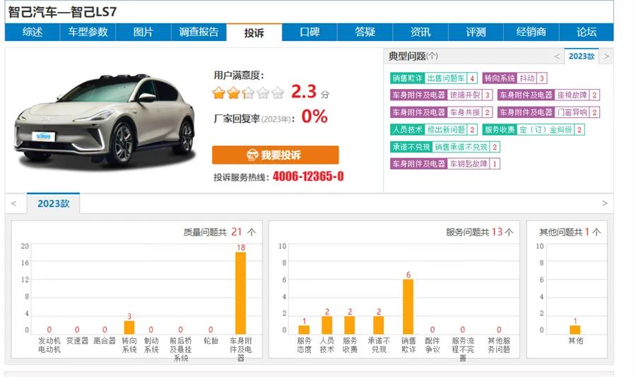 更有趣的是,智己LS7在车质网中的用户满意度仅为2.3分,甚至厂家回复率为“0”,这与其“由上汽集团、张江高科和阿里巴巴集团共同打造的全新用户型汽车科创公司”的定位形成了鲜明的反差。