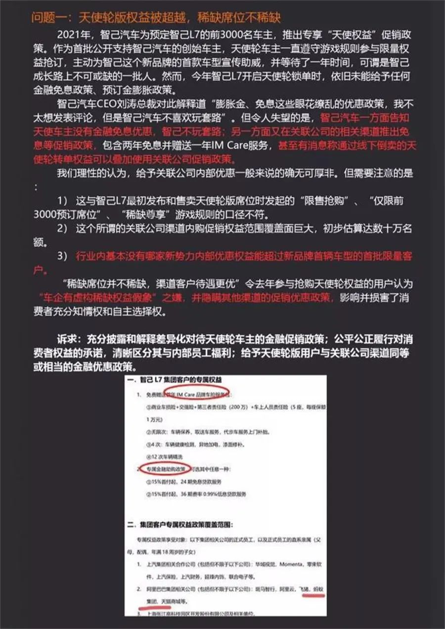 但这些车主却遭到了“背刺”,上百名天使轮准车主发布联合声明,要求智己对配置表电池容量与工信部登记不符、天使轮版权益受损、升级激光雷达和高阶能量电池、车展发布和广告宣传未兑现内容、以及官方APP社区管理混乱等问题作出回应。