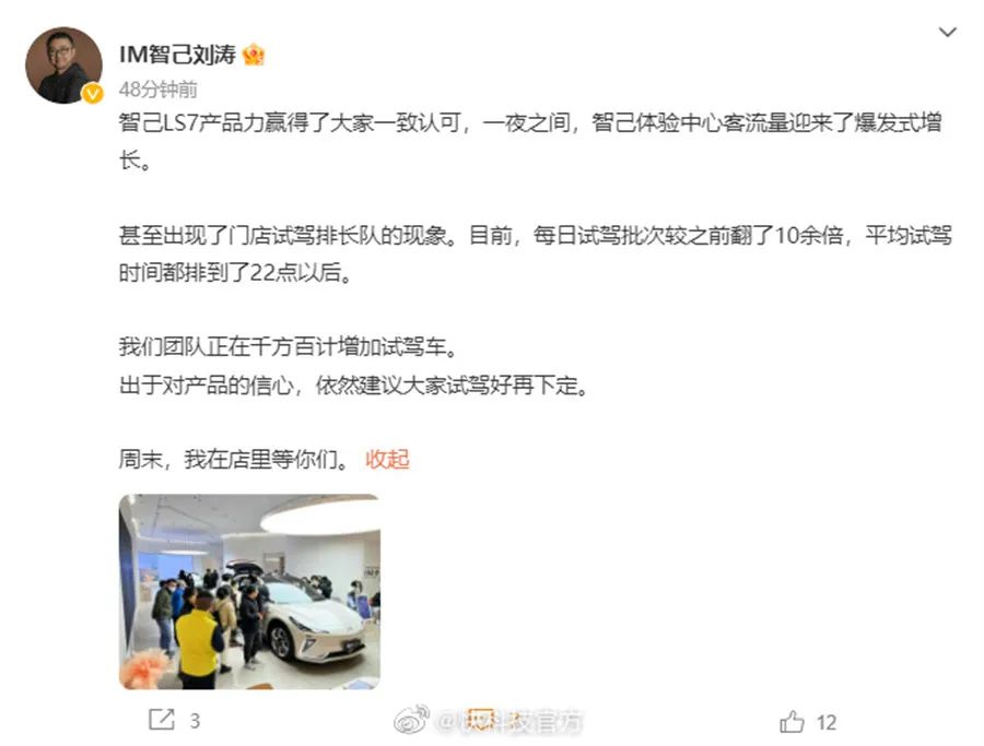 甚至,当时智己汽车联席CEO刘涛发布消息称:智己LS7产品力赢得了大家一致认可,一夜之间,智己体验中心客流量迎来了爆发式增长,甚至出现了门店试驾排长队的现象。目前,每日试驾批次较之前翻了10余倍,平均试驾时间都排到了22点以后。