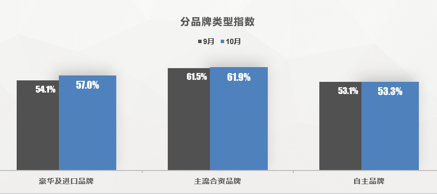 从不同品牌档次分指数来看,豪华品牌分指数明显上升,而合资品牌和自主品牌的预警指数基本与上月持平。郎学红分析,豪华品牌在四季度开始,整体来说进入四季度以后以刚需的购买占比会提升。因为从四季度到明年1月份,低线城市以及农村居民首购汽车需求将更加集中得到释放,购车、增购车占比将下降,所以豪华品牌的压力会有所提升。