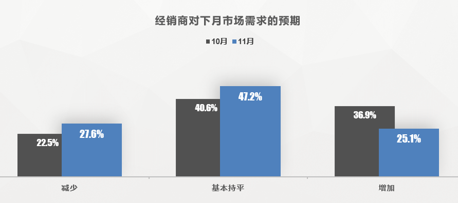 汽车经销商对11月市场预判相对谨慎,经销商认为11月市场需求持平。认为下月市场需求“减少”的经销商比例为27.6%;认为需求“持平”的比例为47.2%;认为“增加”的比例为25.1%。认为11月经营状况“不好”的经销商比例为26.6%;认为经营状况“一般”的比例为64.3%;认为经营状况“好”的比例为9.0%。