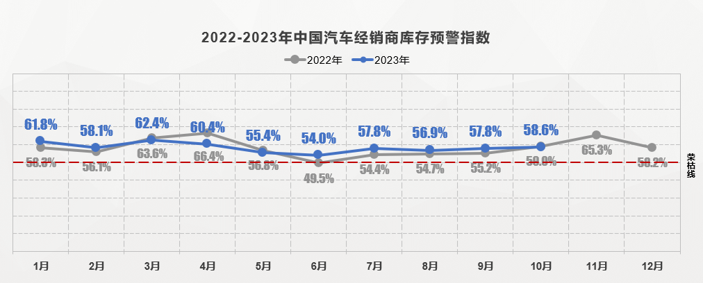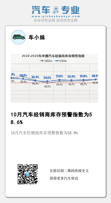 近日,中国汽车流通协会发布“中国汽车经销商库存预警指数调查”显示,2023年10月中国汽车经销商库存预警指数为58.6%,同比下降0.4个百分点,环比上升0.8个百分点。中国汽车流通协会副秘书长郎学红围绕指数进行了分析。
