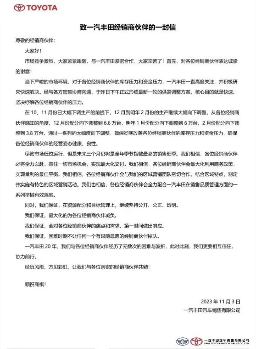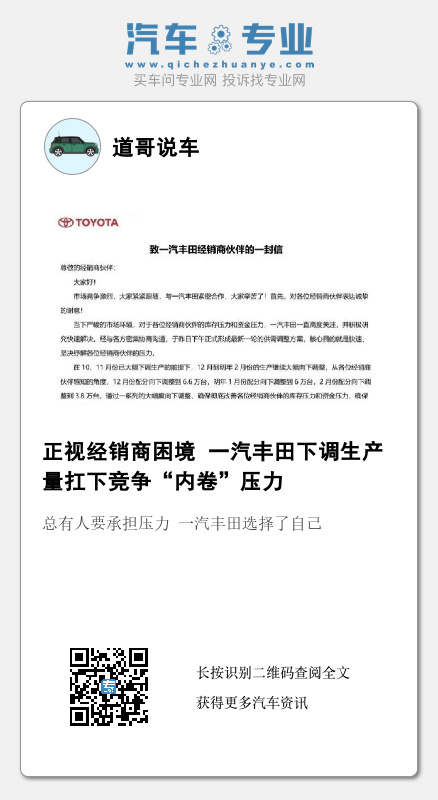 【文/财圈社&道哥说车 麻建宇】一封一汽丰田写给经销商伙伴的信,不断传播、发酵。在这封信中,很多朋友都能提炼出一个关键点:一汽丰田减产了。根据信中内容,一汽丰田在10、11月份已大幅下调生产的前提下,12月到明年2月份的生产将继续大幅向下调整。