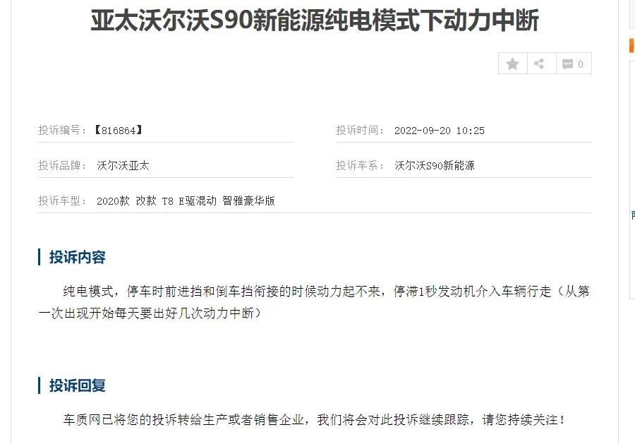 而沃尔沃新能源当前的旗舰车型,沃尔沃S90新能源竟然还出现过纯电模式下动力中断的问题,一位2020款改款T8 E驱混动智雅豪华版S90新能源车主在投诉中称,“纯电模式,停车时前进挡和倒车挡衔接的时候动力起不来,停滞1秒发动机介入车辆行走(从第一次出现开始每天要出好几次动力中断)”。