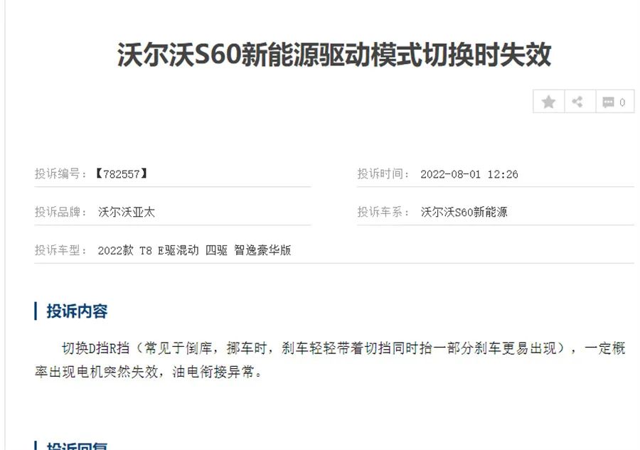 据悉,近日,2022年10月,沃尔沃曾因“部分插电式混合动力车辆因动力电池模组电芯存在内短路,当动力电池处于高能量状态时可能出现电池模组过热,极端情况下导致动力电池热失控,存在安全隐患”召回过4720辆车型。事实上,有关三电问题的投诉,不止出现在沃尔沃XC60新能源上,一位2022款T8 E驱混动四驱智逸豪华版S60新能源车主在投诉中反映了该车型电机或者更准确说是“油电模式切换”问题:电机频繁失效了!纯电模式下,只要倒车入库或侧方停车,R挡和D挡切换时,电机都会失效,发动机就会启动!