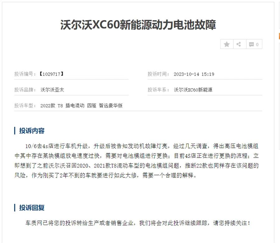 另有2022款T8插电混动四驱智远豪华版XC60新能源车主在投诉中反映了动力电池故障的问题,其在投诉中称,去4s店进行车机升级,升级后被告知发动机故障灯亮,经过几天调查,得出高压电池模组中其中存在某块模组放电速度过快,需要对电池模组进行更换。并且车主还进行了“推断”:“目前4S店正在进行更换的流程;立即想到了之前沃尔沃召回2020、2021款T8混动车型的电池模组问题,推断22款也同样存在该问题的风险,作为刚买了2年不到的车就要进行如此大修,需要一个合理的解释”。