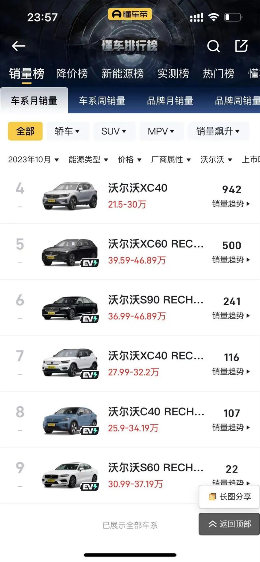 据懂车帝销量排行榜,沃尔沃目前在售的XC60/S60/S90/XC40/C40 RECHARGE五款新能源车型,10月销量没有一款是突破600辆的,销量最高的XC60 RECHARGE当月销量500辆,销量最差的沃尔沃S60 RECHARGE当月销量仅22辆。并且,沃尔沃旗下新能源汽车销量低迷已经持续了较长一段时间。