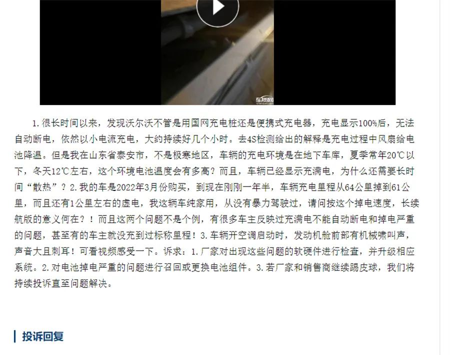 从车质网、财圈社等投诉平台信息看,沃尔沃新能源销量冠军“XC60 RECHARGE”销量虽然不高,但投诉量却并不少,甚至作为插电混动车型,其电池相关功能还成为了投诉焦点。一位2022款T8插电混动四驱长续航智远豪华版XC60新能源车主在投诉中称,“发现沃尔沃不管是用国网充电桩还是便携式充电器,充电显示100%后,无法自动断电,依然以小电流充电,大约持续好几个小时”,并且该车主还遇到了掉电严重的问题,据车主自述“我的车是2022年3月份购买,到现在刚刚一年半,车辆充电里程从64公里掉到61公里,而且还有1公里左右的虚电,我这辆车纯家用,从没有暴力驾驶过,请问按这个掉电速度,长续航版的意义何在”?