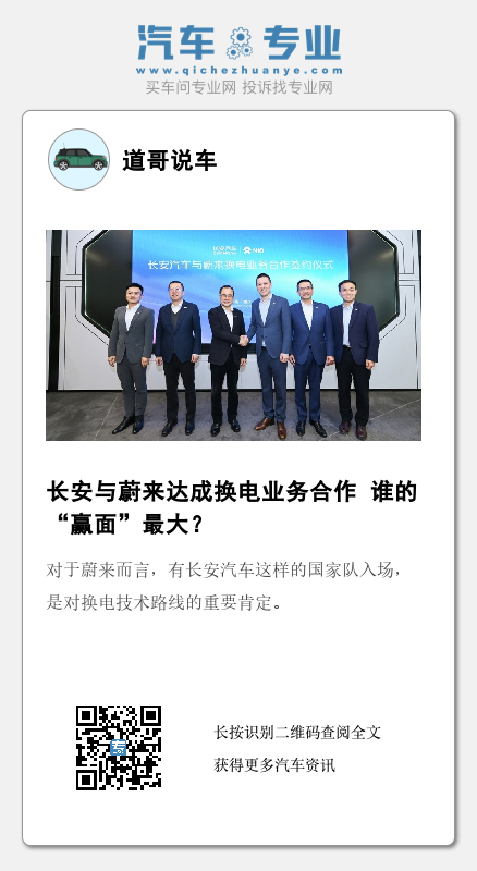 长安在新能源纯电领域的野心勃勃昭然若揭,加入蔚来换电体系,有利于提升长安旗下新能源车型市场竞争力及用户补能体验,让长安纯电汽车的全国补能能力迅速迈上一个新台阶。