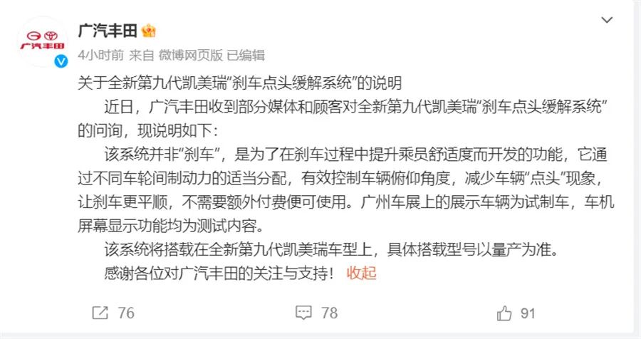 据广汽丰田声明,“刹车点头缓解系统”并非“刹车”,是为了在刹车过程中提升乘员舒适度而开发的功能,它通过不同车轮间制动力的适当分配,有效控制车辆俯仰角度,减少车辆“点头”现象,让刹车更平顺。