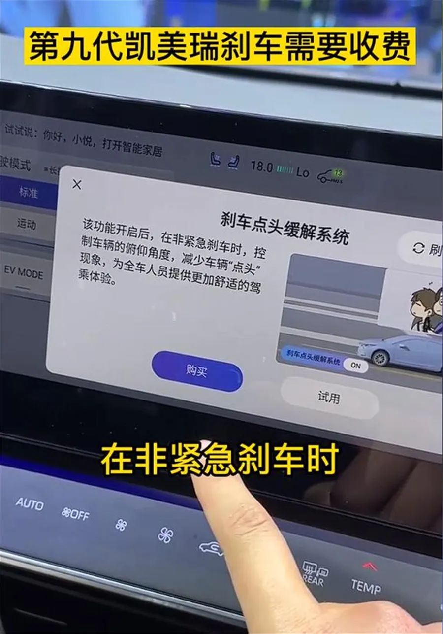 网传信息显示,广州车展上,广汽丰田第九代凯美瑞车机界面有关“刹车点头缓解系统”介绍下方,竟然出现了“购买”的选项。
