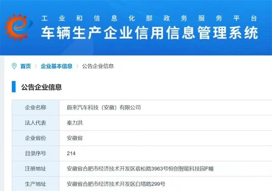 【文/财圈社&道哥说车 麻建宇】据工信部网站显示,蔚来汽车科技(安徽)有限公司出现在“车辆生产企业信用信息管理系统”中,此信息也被解读为蔚来获得独立生产资质的标志。蔚来联合创始人、总裁秦力洪就此对《财圈社&道哥说车》编辑回应称,这是根据相关规定所履行的正常的生产管理程序,目前公司没有进一步信息可以发布。