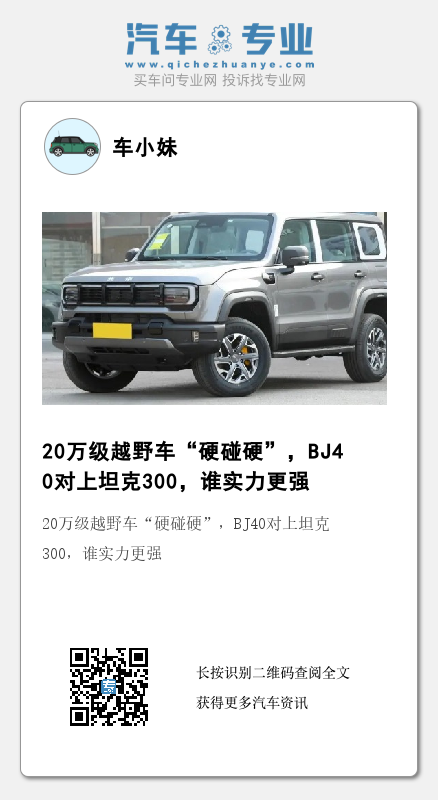 总结:硬派越野SUV的市场热度已经是达到顶峰,全新BJ40看准时机上市也确实是很聪明,现在坦克300因为上市时间早确实缺少惊艳的产品效果,配合更丰富配置带来较高性价比,你觉得这两款车型谁更胜一筹?作为挑战者的全新BJ40确实有惊喜,但和经过市场验证的成熟产品坦克300相比,还需要更多的时间来检验其作为越野车的耐用性是否够格。