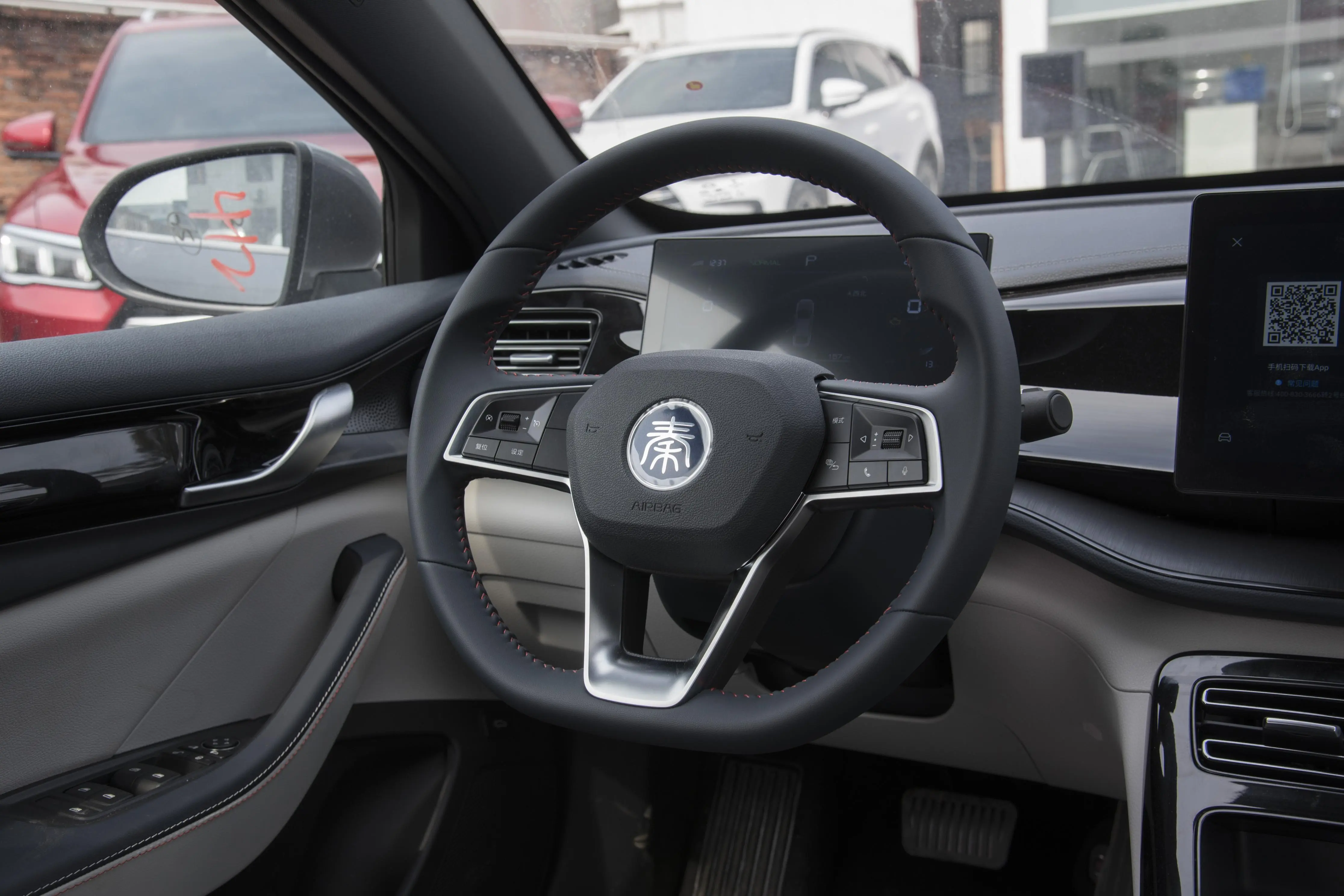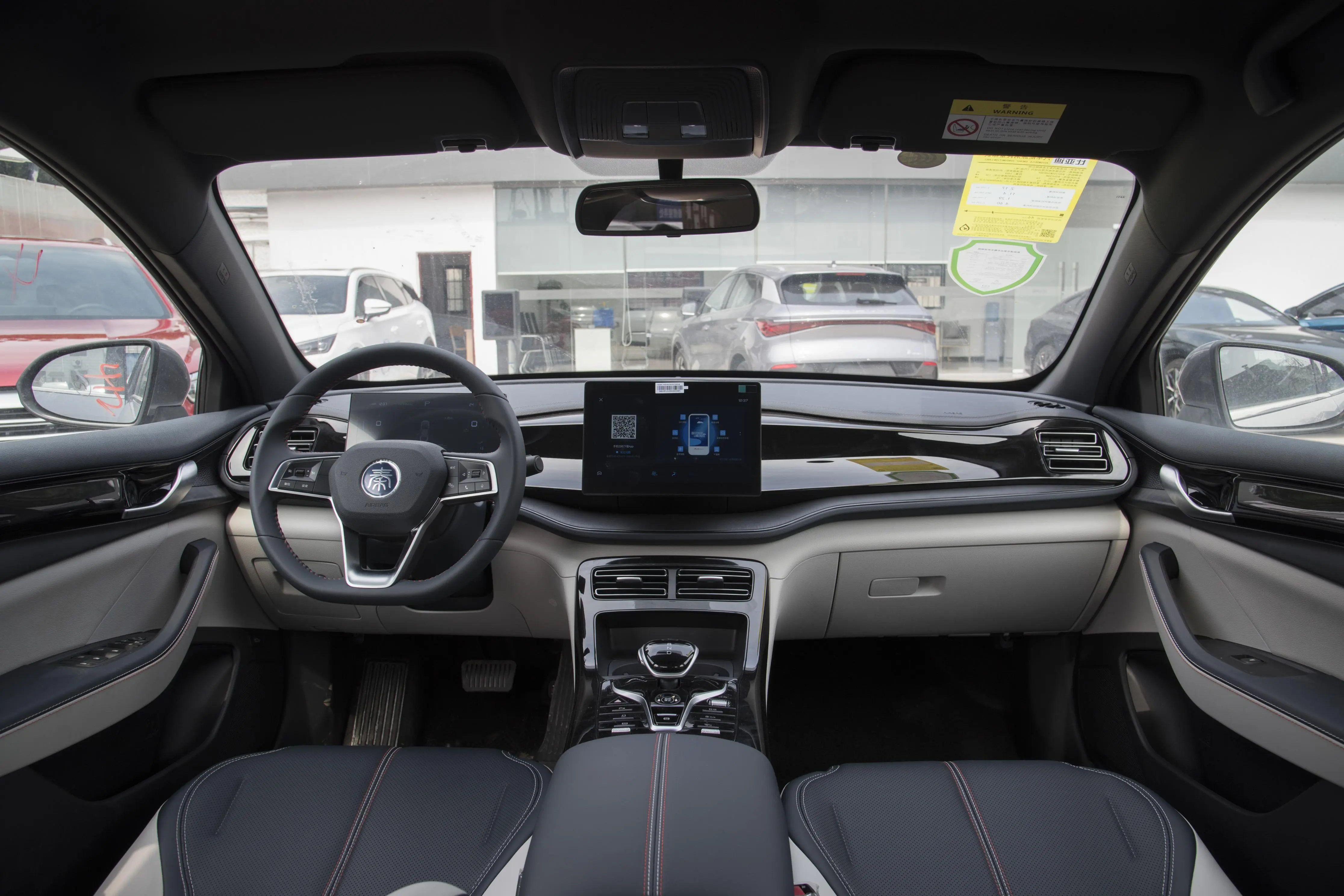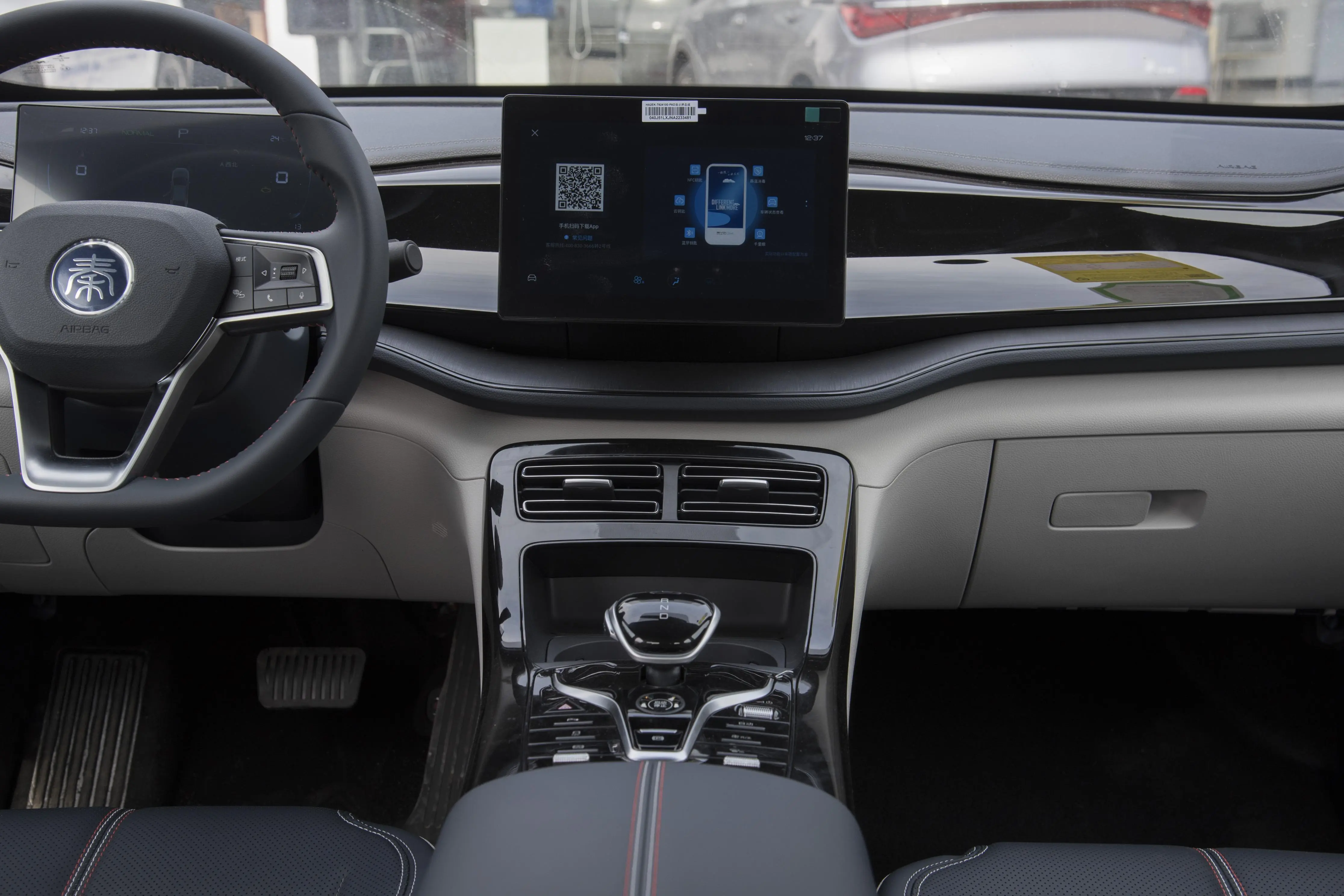 采用环抱式设计,行云蓝的内饰配色高级,大面积的皮质包覆提升了档次感。多功能平底方向盘时尚运动,支持多向调节。仪表盘为8.8英寸全液晶,中控搭载带DiLink智能车载系统的10.1英寸液晶大屏。