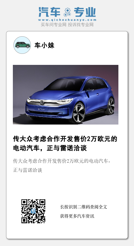 对此报道,大众拒绝置评。雷诺的一位发言人表示,为了保证在小型电动汽车市场的竞争力,合作是必要的。该发言人表示,“我们正在进行很多的讨论,但目前还没有任何结果。”