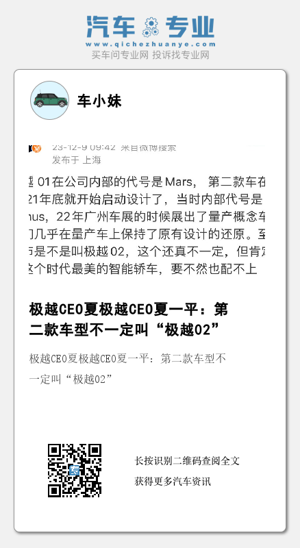 12月11日消息,集度CEO、极越CEO夏一平日前在微博发文,透露了旗下第二款车型的相关信息。