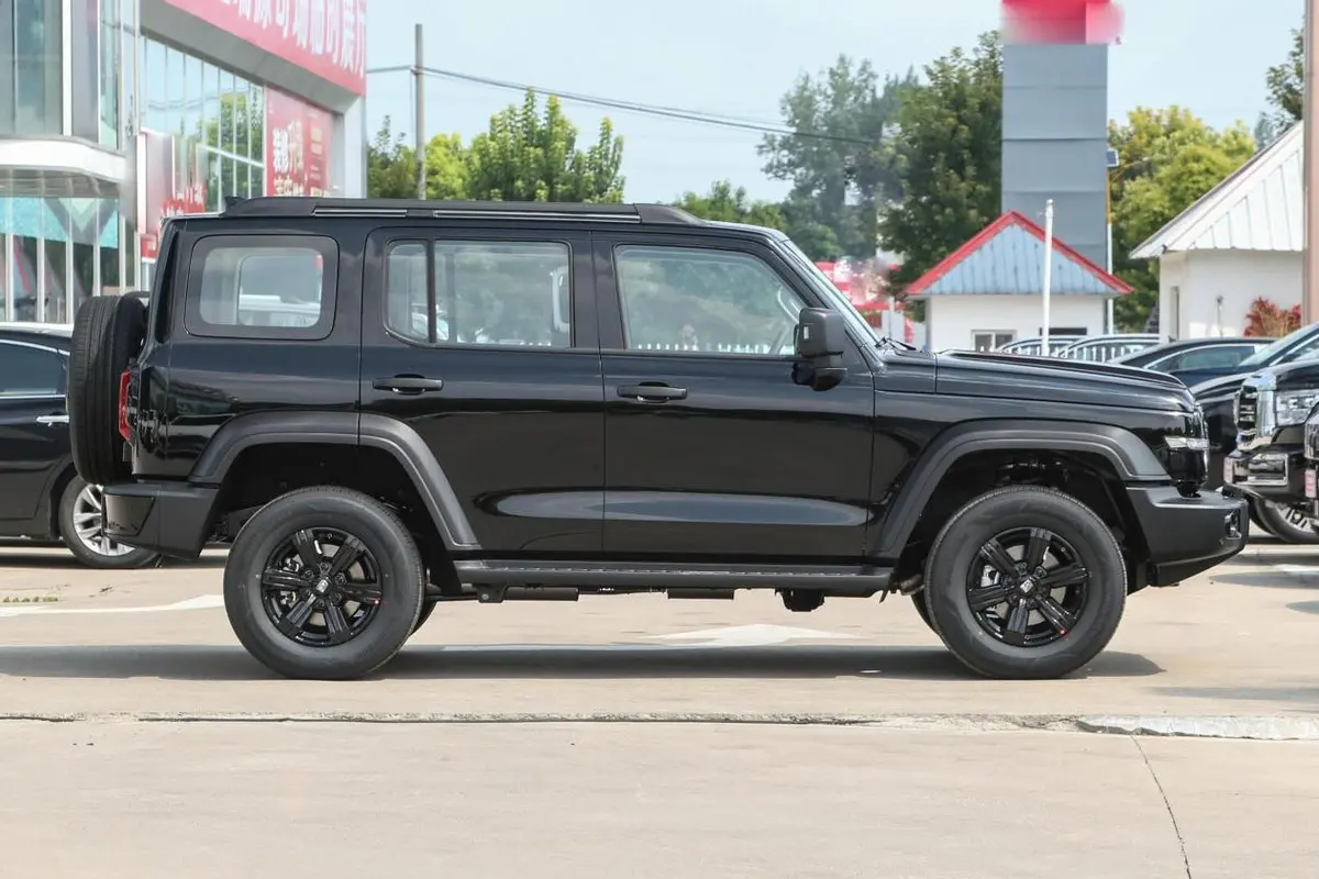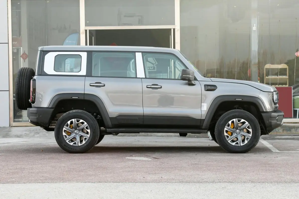 接着再来看两者的侧面设计,硬派越野车象征的方正造型以及外凸的黑色轮眉,都没有在这两款车上缺席,设计有着颇高的相似度。但和前脸设计一样,全新BJ40城市猎人版的亮点依旧集中在细节区域,车窗周围的镀铬饰板,进一步提升了侧面的精致感,其次花瓣样式的铝合金轮毂、黄色涂装的刹车卡钳以及无框车门的运用,也给其增添了几分时尚气息。而坦克300传统的设计风格,看起来还是比较霸气的。