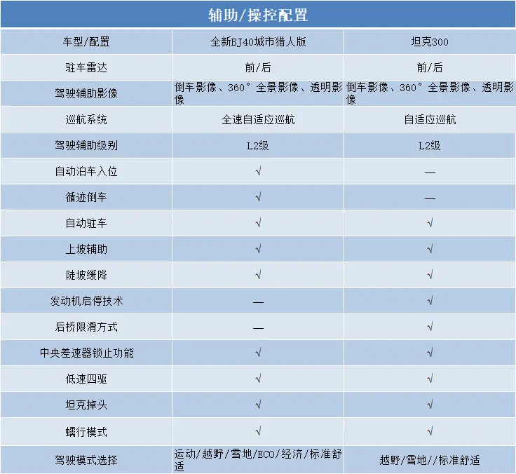 在辅助/操控配置方面,两款车均配备了前/后驻车雷达、360°全景影像、透明影像、L2级辅助驾驶、自动驻车、上坡辅助、陡坡缓降、中央差速器锁止功能、低速四驱、坦克掉头、蠕行模式和越野/雪地/标准舒适驾驶模式。另外全新BJ40城市猎人版还多出了全速自适应巡航、自动泊车入位、循迹倒车和越野/ECO/经济模式。坦克300仅配备自适应巡航、但额外多出了发动机启停和后桥差速锁。