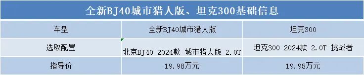 为了确保此次对比评测的客观公正性,个人特意选取了价格处于同一区间的配置版本,它们分别是北京BJ40 2024款 城市猎人版 2.0T 自动四驱 侠客型以及坦克300 2024款 2.0T 挑战者,官方售价均为19.98万元。