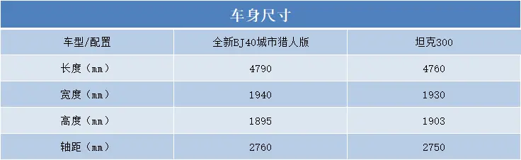 尺寸部分,两者均是紧凑型SUV的定位,全新BJ40城市猎人版的长宽高分别为4790/1940/1895mm,车身轴距达到2760mm;坦克300则有着4760/1930/1903mm的长宽高以及2750mm的车身轴距。不难看出全新BJ40城市猎人版在车身长度和轴距上占据着一定优势。