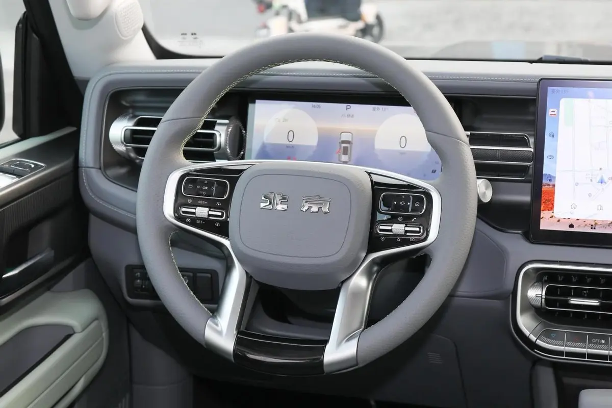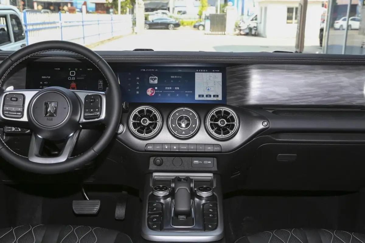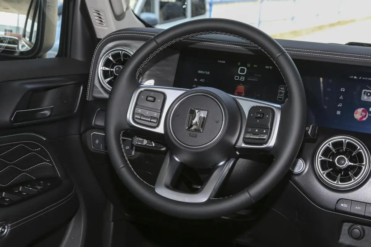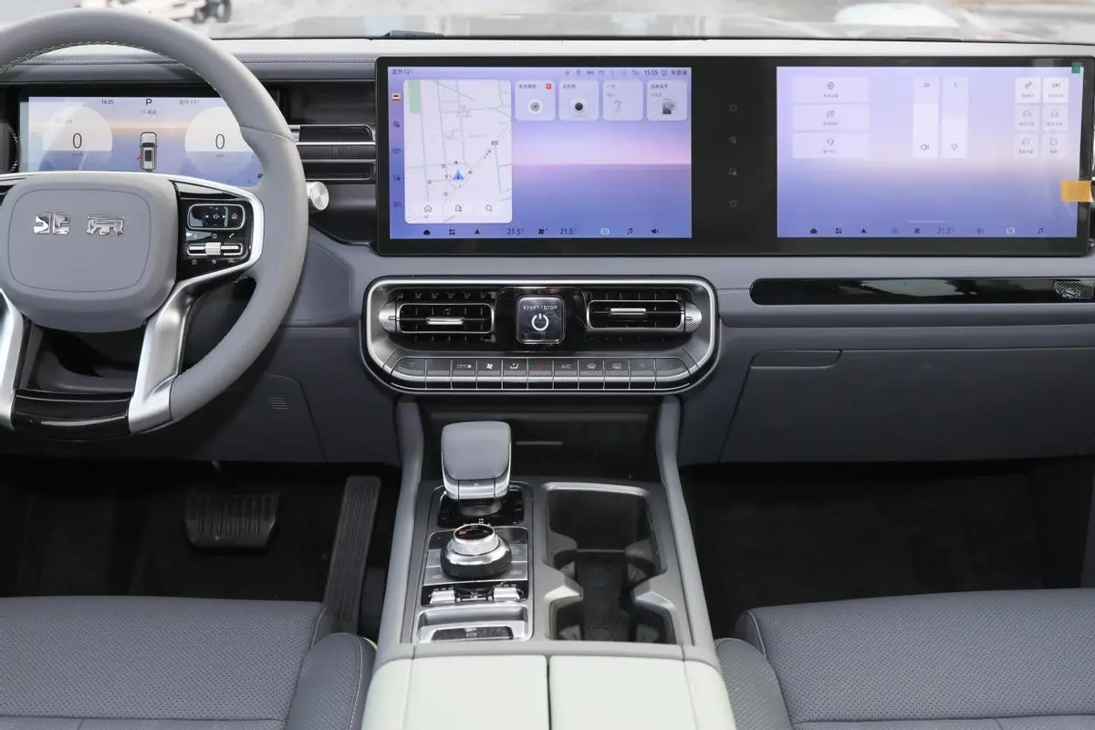 内饰方面,全新BJ40城市猎人版在设计和用料上值得肯定。通过实拍图能够直观看出,车内取消了以往繁琐的物理按键,搭配双12.8英寸的中控显示屏和副驾驶娱乐屏组成的双联屏,营造出不错的科技感。此外大面积软质材料包覆其中,同时有着扎实的细节做工,不管是视觉观感,还是实际手感,都有着可圈可点的表现。坦克300的内饰造型则侧重于传统常规风格。对称式的中控台布局,双12.3英寸的中控仪表和中控屏幕采用联屏式设计,整体显得层次感分明。类似螺旋桨样式的空调出风口以及飞机电子挡把,凸显出较强的机械感。另外副驾驶座前方宽大的扶手,也较好深化了硬派越野车的定位身份。