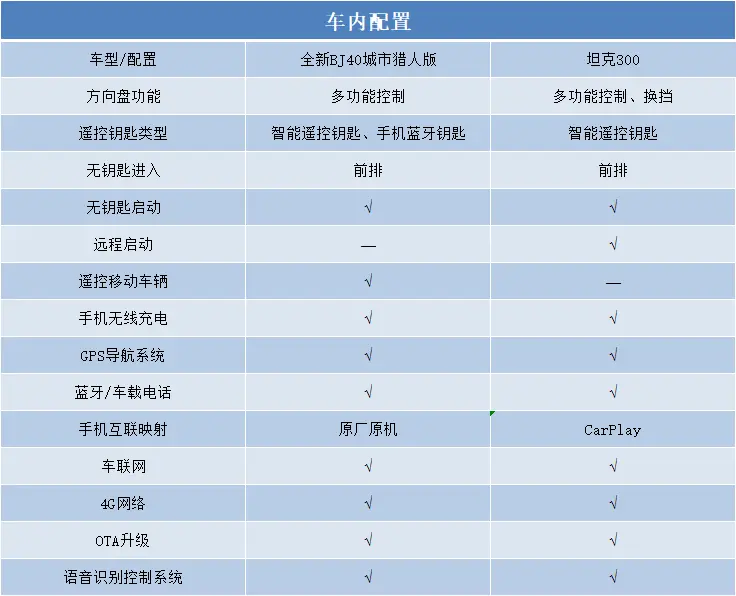 在舒适性功能方面,多功能方向盘、智能遥控钥匙、前排无钥匙进入、无钥匙启动和手机无线充电功能在两款车型上均有配备。不同的是,全新BJ40城市猎人版多出了手机蓝牙钥匙、遥控移动车辆,而坦克300则多出了方向盘换挡和远程启动。而在智能互联配置上,两款车均配备了GPS导航系统、蓝牙/车载电话、车联网、4G网络、OTA升级和语音识别控制系统。另外全新BJ40城市猎人版多出了原厂原机互联,坦克300则多出了CarPlay。