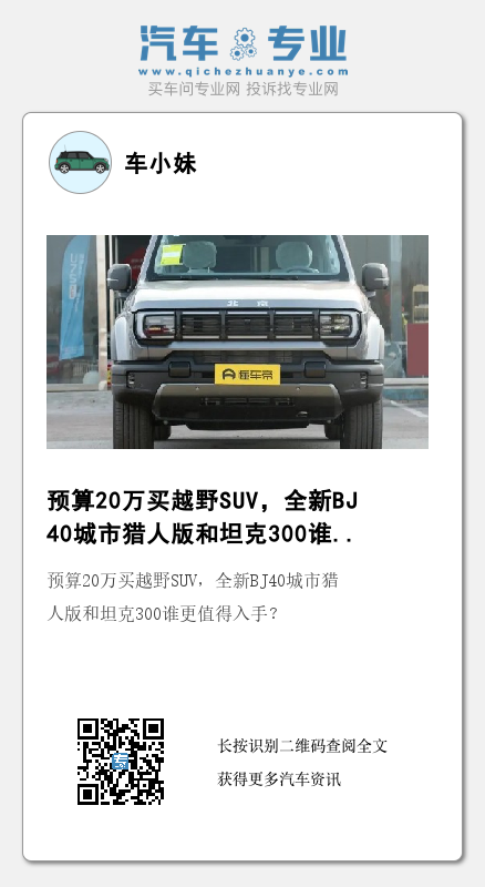 近两年来,硬派越野车受到了越来越多的消费者追捧,不少自主品牌也纷纷抓住这一机遇,推出了诸多高品质的车型可供大家选择。在这其中,全新北京BJ40(图片|配置|询价)城市猎人版以及坦克300(图片|配置|询价),就成为了相对热门的车型,两者之间该如何选择?也困扰着不少潜在消费者。本篇文章笔者就通过对比的方式,来客观解读一下两者的产品力表现,看看谁略胜一筹?同等预算的情况下,谁更值得入手呢?