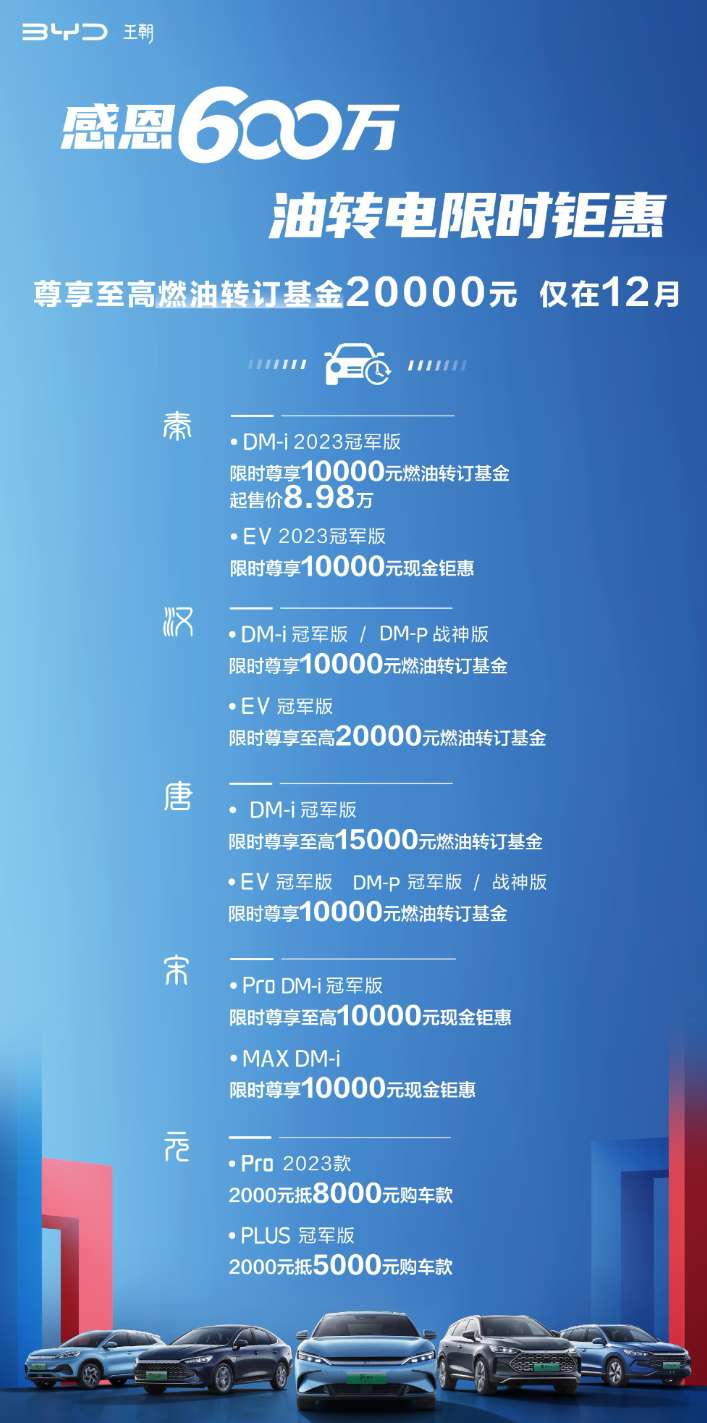 12月初,比亚迪王朝网就开启了限时优惠政策,12月内购买旗下的秦、汉、唐、宋、元车系可享受1万元或2万元的现金优惠。11月份,比亚迪海洋网开启现金优惠,紧接着是比亚迪王朝网,比亚迪之所以这么干,主要是因为它有年销300万辆的目标在这里,比亚迪必须要完成,这是板上钉钉的事。想要在最短的时间内完成既定目标,毫无疑问降价是最有效的手段。
