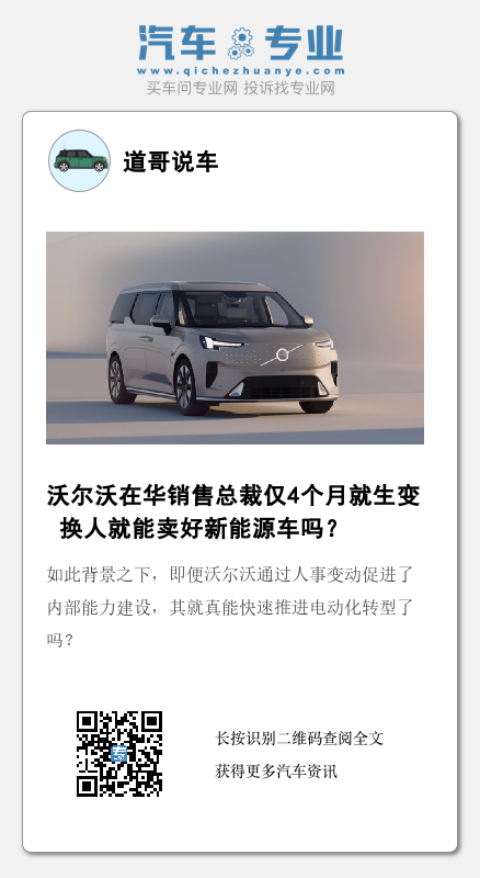 财圈社不具名专家对《道哥说车》编辑表示,对于销售公司总裁这个职位,起码要给人一到两年的时间,了解市场,了解经销商体系,沃尔沃这么快就进行了大中华区销售公司总裁的轮换,实在太不正常了。